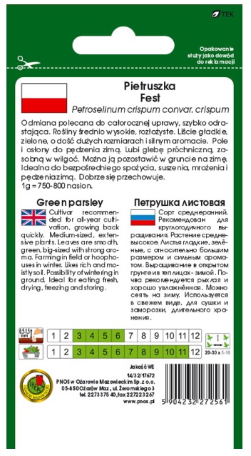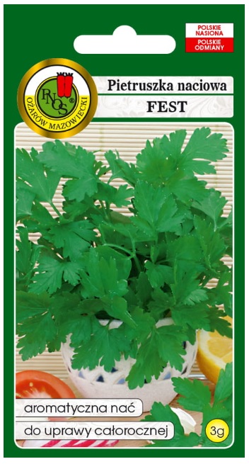 Pietruszka naciowa Fest to odmiana polecana do całorocznej uprawy, szybko odrastająca. Rośliny średnio wysokie, rozłożyste. Liście gładkie, zielone, o dość dużych rozmiarach i silnym aromacie. Okres wegetacji wynosi 75-90 dni (wiosną i latem) oraz 140-160 dni w uprawie jesiennej. Polecana do bezpośredniego spożycia, suszenia, mrożenia i pędzenia zimą. Wymaga gleby próchnicznej, zasobnej w wilgoć, nie zaskorupiającej się. Można ją pozostawić w gruncie na zimę. Dobrze się przechowuje.
