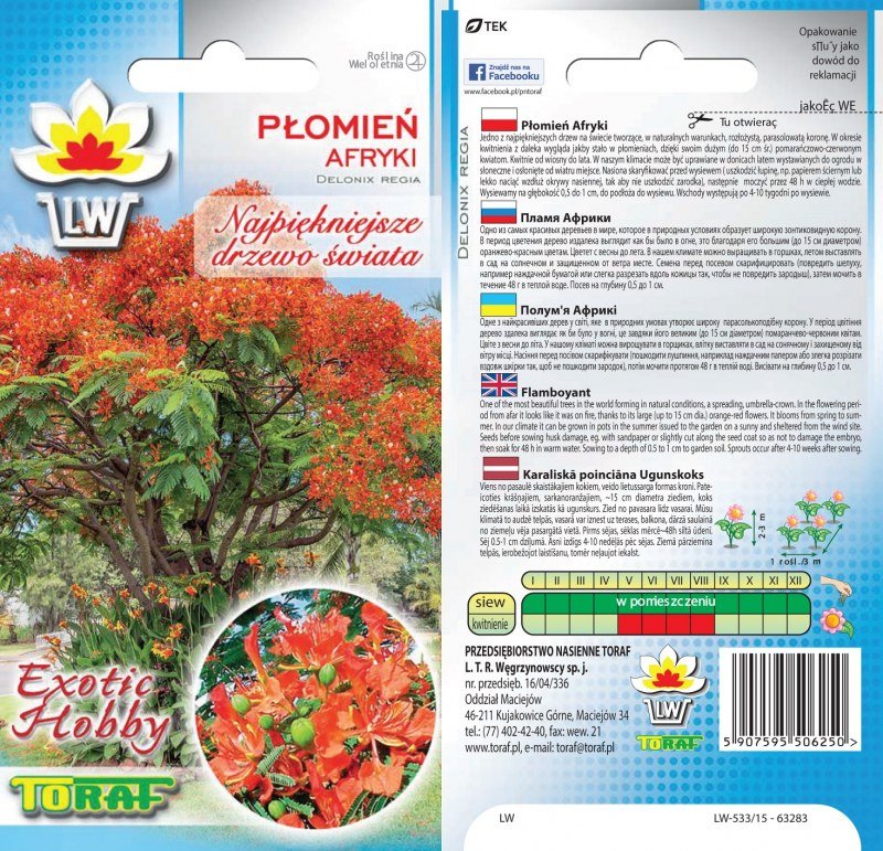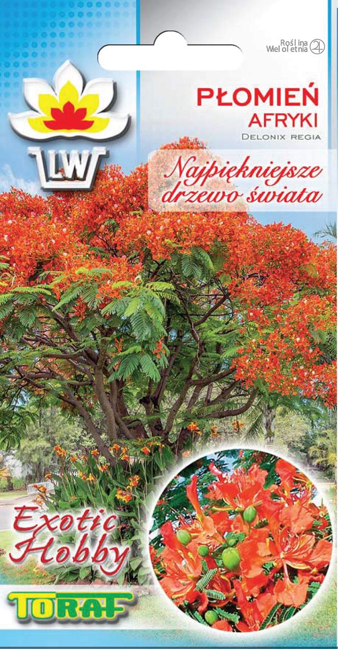 Płomień Afryki to drzewo tworzące, w naturalnych warunkach, rozłożystą, parasolowatą koronę. Wysokość do 9m, szerokość od 5 do 10m. Liście ciemnozielone, długie, podwójnie pierzasto złożone.