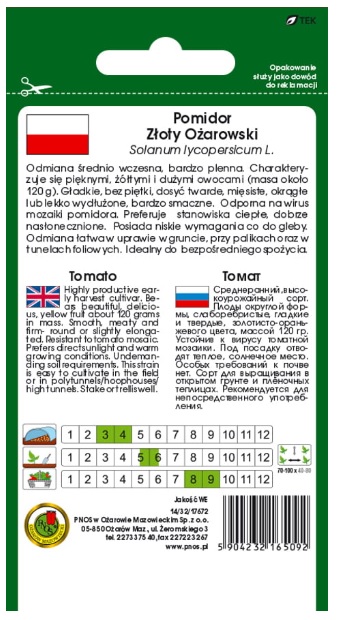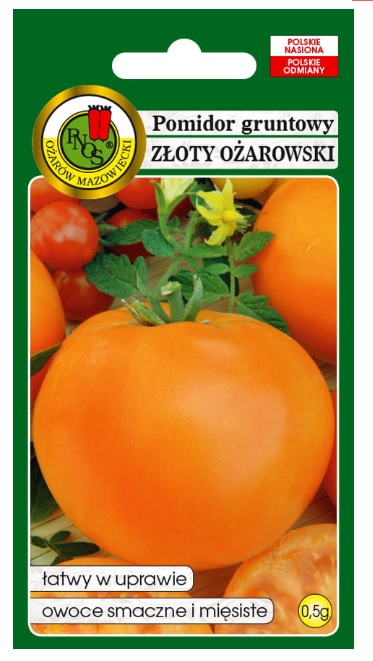 Pomidor Złoty Ożar to odmiana średnio wczesna. Odmiana o ciągłym wzroście i pięknych pomarańczowych owocach. Owoce duże i bardzo duże (średnia masa około 120 g), gładkie, bez piętki, dosyć twarde, mięsiste, okrągłe lub lekko wydłużone, bardzo smaczne. Średnio wczesna, bardzo plenna, odporna na wirus mozaiki pomidora. Polecana do amatorskiej uprawy w gruncie przy palikach oraz w tunelach foliowych. Preferuje stanowiska ciepłe, dobrze nasłonecznione. Ilość dni od posadzenia do zbioru: 95-100.