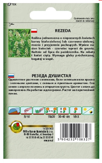 Rezeda wonna to o małych kwiatach barwy biało zielonej lub czerwono-zielonej o silnym, przyjemnym zapachu. Rezeda wonna zakwita w czerwcu i może nieprzerwanie kwitnąć aż do późnej jesieni (do października), roztaczając wokół siebie przyjemną woń (jest cenioną rośliną w przemyśle perfumeryjnym). Z tego względu powinna być sadzona jako obwódka w pobliżu miejsca wypoczynku, altany, tarasu lub okien domu.