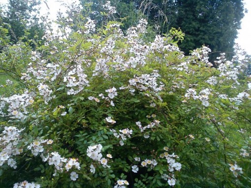 Róża wielokwiatowa to gatunek bardzo zmienny. Krzewy rosną intensywnie, są bardzo gęste, przeważnie dorastają do około 3 m wysokości i takiej samej średnicy, ale wspinając się na naturalne podpory mogą osiągać znacznie większą wysokość. Kwiaty są małe, pachnące, średnicy 2-3 cm, białe, rzadziej lekko zaróżowione, zebrane w wielokwiatowe wiechy. Kwitnie na przełomie czerwca i lipca, bardzo obficie, na ubiegłorocznych pędach. Owoce są czerwone, gładkie, drobne, wielkości grochu, bez kielicha, dojrzewające w sierpniu i wrześniu, są one bardzo ozdobne. Liście występujące u róży wielokwiatowej są zmiennej wielkości, dość duże, 7-9 listkowe, zwykle błyszczące i świeżozielone. Listki są odwrotnie jajowate lub eliptyczne, piłkowane, nagie lub owłosione, jesienią długo utrzymujące zieloną barwę, czasem zmieniającą się na pomarańczowoczerwoną. Pędy długie, zwisające lub wspinające, zielone lub brązowe, o średniej wielkości zakrzywionych licznych kolcach, osiągają do 4-7 m długości. Bez podpór pędy przewieszają się łukowato i są splątane. Zazwyczaj krzewy nie przemarzają, uszkodzenia zdarzają się tylko podczas surowych sezonów zimowych. Po przycięciu regenerują się szybko. Odporność na choroby dobra, ale zdarza się, że krzewy są porażane przez mączniaka prawdziwego i czarną plamistość.