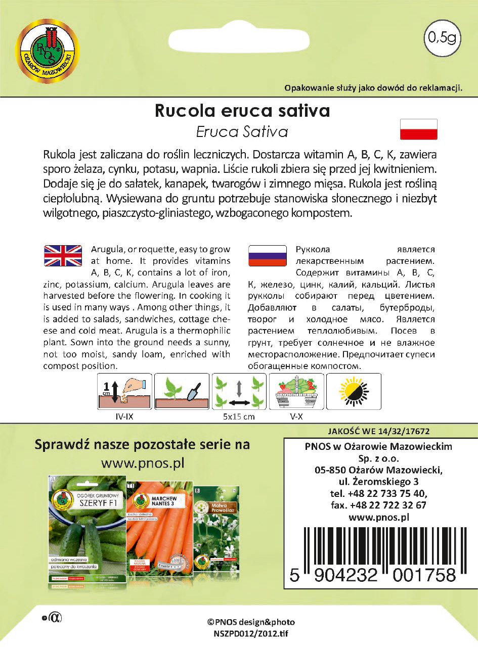 Terminy siewu rukoli: od marca do maja – ale tylko pierwsze dni maja,drugi siew od sierpnia do pierwszych dni września. Rukola wschodzi już po 4-6 dniach. Do wykiełkowania potrzebuje temperatury od 2 st. Celsjusza. Wyrywa się całe rośliny z korzeniami albo ścina liście. Preferuje stanowiska słoneczne lub pół cieniste, jednak niezbyt dobrze znosi letnie, południowe słońce. Roślina dobrze funkcjonuje w naszej strefie klimatycznej, znosi temperatury do -3,9 st. C. Roślina wymaga wilgotnej ziemi, toteż wskazane jest podlewanie. Dodaje się je do sałatek, kanapek, twarogów i zimnego mięsa.