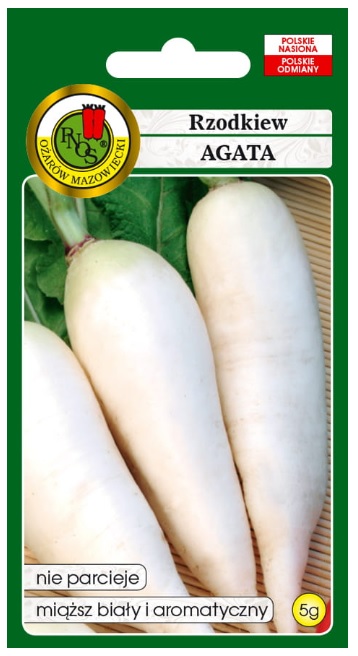 Rzodkiew Agata to wspaniała odmiana przeznaczona do uprawy od wiosny do jesieni w gruncie oraz w okresie wczesnowiosennym i późnojesiennym pod osłonami. Zgrubienia korzeniowe białe, klinowate o długości 20-25cm i masie ok. 200g. Wyjątkowo aromatyczne. Miąższ biały, soczysty, bardzo smaczny. Preferuje stanowiska słoneczne i półcień. Roślina łatwa w uprawie. doskonała na surówki. sok ma działanie lecznicze przy schorzeniach wątroby. Bardzo długo utrzymuje dojrzałość konsumpcyjną nie parciejąc i nie wybijając w pędy kwiatostanowe.