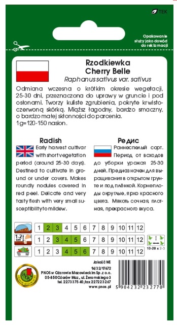 Rzodkiewka Cherry Belle to odmiana o krótkim okresie wegetacji przeznaczona do uprawy wiosennej i jesiennej pod osłonami i w gruncie. Tworzy zgrubienia kuliste lub lekko owalne barwy jednolicie jaskrawo-czerwonej z małą rozetą liści. Miąższ o konsystencji masłowej, łagodny, bardzo smaczny o małej skłonności do parcenia.