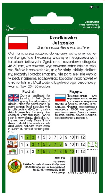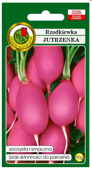 Rzodkiewka Jutrzenka jest przeznaczona do uprawy od wiosny do jesieni w gruncie i wczesną wiosną w nieogrzewanych tunelach foliowych. Zgrubienia korzeniowe długości 45-60 mm, walcowate, wybarwione jednolicie na różowo. Skórka bardzo cienka, miąższ biały, szklisty, delikatny, soczysty i bardzo smaczny. Nie parcieje i nie wybija w pędy nasienne, zachowując łagodny smak nawet w okresie letnim. Długo zachowuje dobrą jakość konsumpcyjną.