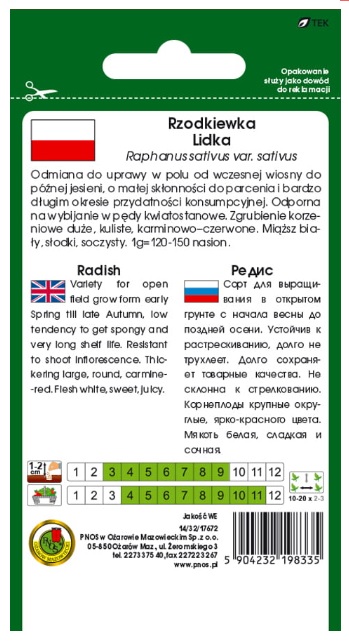 Rzodkiewka Lidka jest przeznaczona do uprawy w polu od wczesnej wiosny do późnej jesieni. Zgrubienie korzeniowe duże, kształtu kulistego, barwy karminowo-czerwonej. Miąższ biały, słodki, soczysty, nieparciejący. Odporna jest na wybijanie w pędy kwiatostanowe. Charakteryzuje się bardzo długim okresem przydatności konsumpcyjnej.