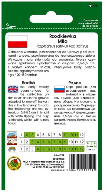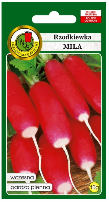 Rzodkiewka Mila jest przeznaczona do uprawy pod osłonami i w polu. Tworzy zgrubienia cylindryczne, długości 3,5-5,5 cm, czerwone z białym końcem. Miąższ odznacza się łagodnym smakiem, jest intensywnie biały, odporny na parcenie. Odmiana przystosowana do jednorazowego zbioru.