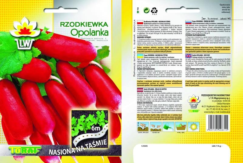 Siew na głębokość 1cm od poł. III do poł. VI na zbiór wiosenny i od VIII do IX na zbiór jesienny. Taśma nasienna ułatwia wysiew, dzięki odpowiedniemu rozmieszczeniu nasion na taśmie eliminując potrzebę stosowania przerywki i pozwala na uzyskanie dobrych plonów. Opakowanie zawiera 6 m taśmy nasiennej.