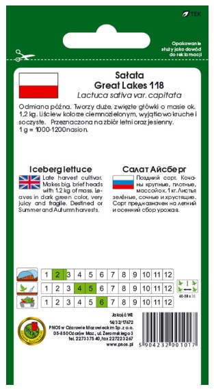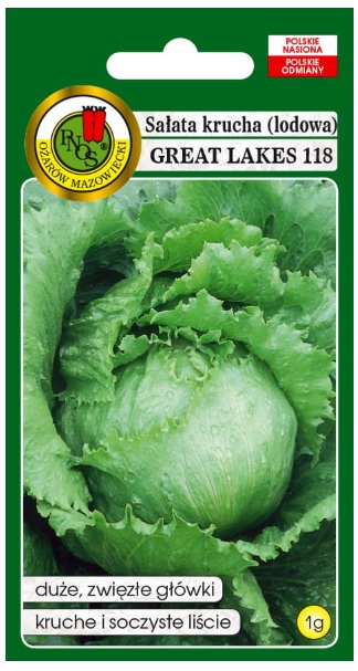 Sałata Great Lakes to sałata krucha (lodowa). Tworzy duże, zwięzłe główki, o masie 1-1,2kg, złożone z ciemnozielonych, soczystych, kruchych i fryzowanych liści. Odporna na wybijanie w pędy kwiatowe. Odmiana do uprawy na zbiór letni oraz jesienny. Dobrze plonuje w zróżnicowanych warunkach upraw. Długo nie wybija w pędy kwiatostanowe.