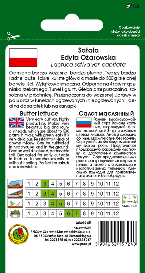 Sałata Edyta Ożar to sałata masłowa. Przeznaczona do wczesnej uprawy w polu oraz w tunelach ogrzewanych i nieogrzewanych. Tworzy duże, ścisłe, kuliste główki o masie dochodzącej do 500g i zielonej barwie liści. Wyjątkowo smaczna. Bardzo interesująca, plenna, odporna na 4 rasy mączniaka rzekomego. Lubi glebę przepuszczalna i bogata w próchnicę. Idealna do kanapek lub na sałatki. Gromadzi najmniej azotanów ze wszystkich znanych odmian.