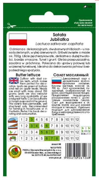 Sałata Jubilatka to sałata masłowa. Odmiana o dekoracyjnych, dwubarwnych liściach – u nasady zielonych, wyżej czerwonych. Liście pęcherzykowate, delikatne o dużej trwałości konsumpcyjnej, bardzo smaczne ze względu na połączenie cech sałaty kruchej i masłowej. Główki zwięzłe o masie ok. 700g. Preferuje glebę przepuszczalna i bogatą w próchnicę. Odmiana polecana do uprawy polowej, a także wczesnej tunelowej.