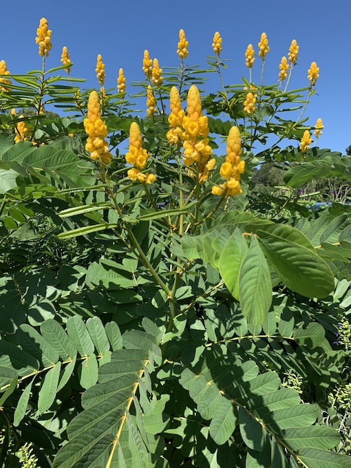 Strączyniec oskrzydlony to roślina tropikalna należąca do rodziny Bobowatych i pochodzi z Meksyku i Karaibów, obecnie gatunek ten szeroko uprawiany jest w wielu miejscach na całym świecie gdzie na stałe wpisała się w naturalny krajobraz terenu. Roślina rośnie szybko i osiąga do 1,5 m wysokość, Strączyniec zakwita już w pierwszym roku uprawy. Kwitnie od lipca do października, kwiaty gęste, intensywnie żółte, osadzone na pionowej łodydze usytuowanej ponad liśćmi, przed rozkwitem pojedynczych kwiatów kwiatostany przypominają grubą, żółtą świecę. Liście duże pierzaste, o właściwościach leczniczych, wykorzystywane m.in. w dermatologii. Gatunek łatwy w uprawie, w naszym klimacie nadaje się do uprawy pojemnikowej w pomieszczeniach od wiosny do jesieni rośliny można wystawiać na taras, balkon lub do ogrodu. Wymaga stanowiska słonecznego osłoniętego od wiatru gleba powinna być żyzna.