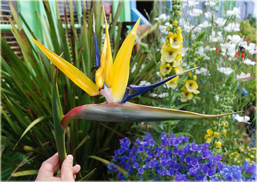 Strelicja królewska (Strelitzia reginae) to roślina tropikalna z egzotycznym kwiatem przypominającym ptaka.