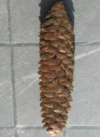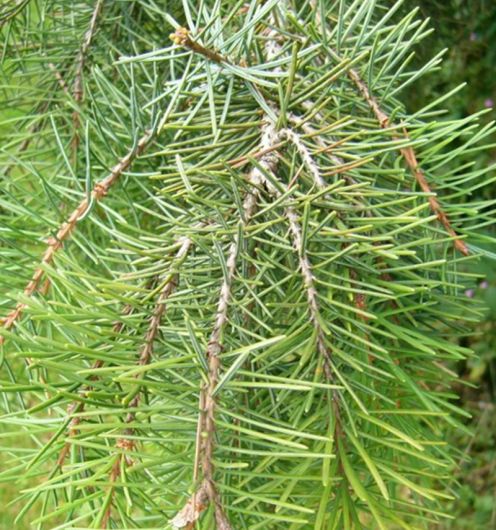 Igły długości 2,5 cm są miękkie, ciemnozielone, z dwoma białozielonymi paskami od spodu, ułożone promieniście i dość luźno na pędzie. Cylindryczne szyszki długości 8-12 cm i szerokości 3-4 cm pojawiają się tylko na starszych roślinach. W młodości są czerwone, a w miarę dojrzewania stają się brązowe.