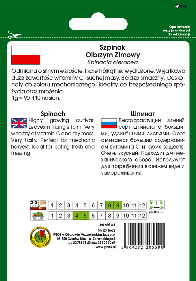 Szpinak Olbrzym Zimowy jest Odporna na wymarzanie, doskonale nadająca się do uprawy z siewu jesiennego oraz wiosennego. Rośliny o silnym wzroście tworzy duże liście trójkątno-strzałkowate. Odmiana bardzo dobrze zimuje i wiosną szybko rośnie. Wyróżnia się dużą zawartością wit. C i suchej masy. Przydatna do zbioru mechanicznego.