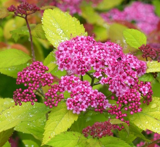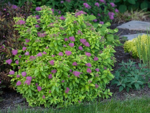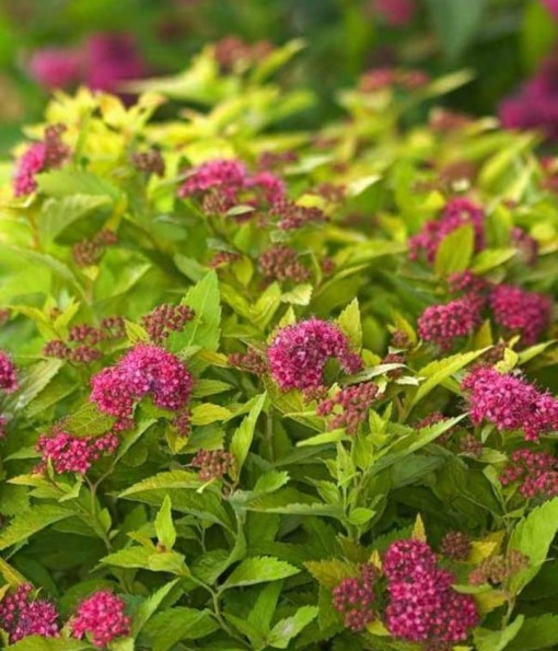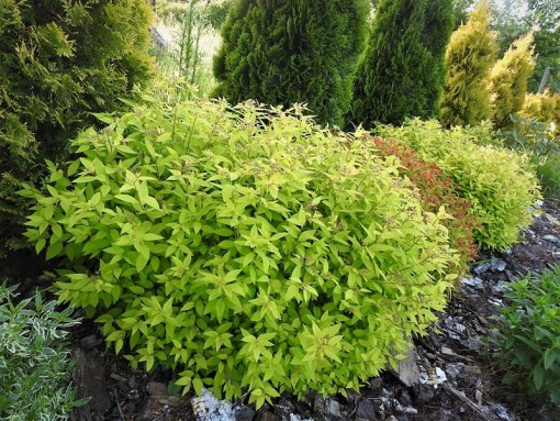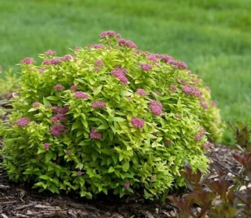 Tawuła to niski krzew o zwartym, półkulistym pokroju. Osiąga wysokość maksymalnie 0,5 m. Głównymi walorami tej odmiany są złociste, eliptyczne liście, które utrzymują się na krzewie od wczesnej wiosny do późnej jesieni. Ich intensywna barwa pięknie kontrastuje z różowymi, drobnymi kwiatami zebranymi w kwiatostany na końcach pędów. Kwitnie obficie w czerwcu oraz w lipcu.