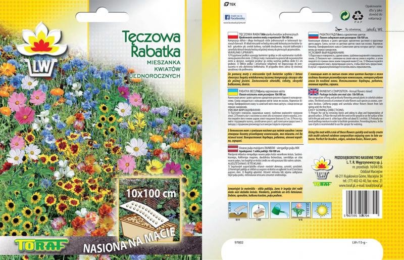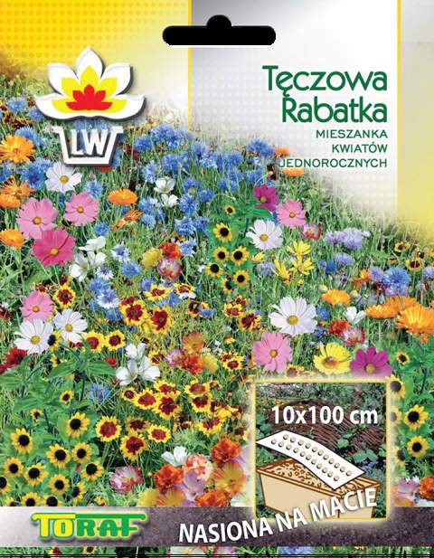 Kompozycja obficie i długo kwitnących roślin jednorocznych w kolorowych tęczowych barwach. W skład mieszanki wchodzą mieszanki kolorystyczne kwiatów takich gatunków jak: onetek karłowy, nachyłek dwubarwny, maczek kalifornijski i sanwitalia których kwiaty kwitną od późnej wiosny do pierwszych przymrozków.