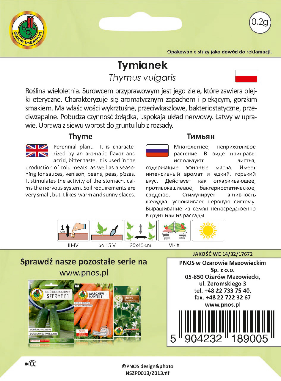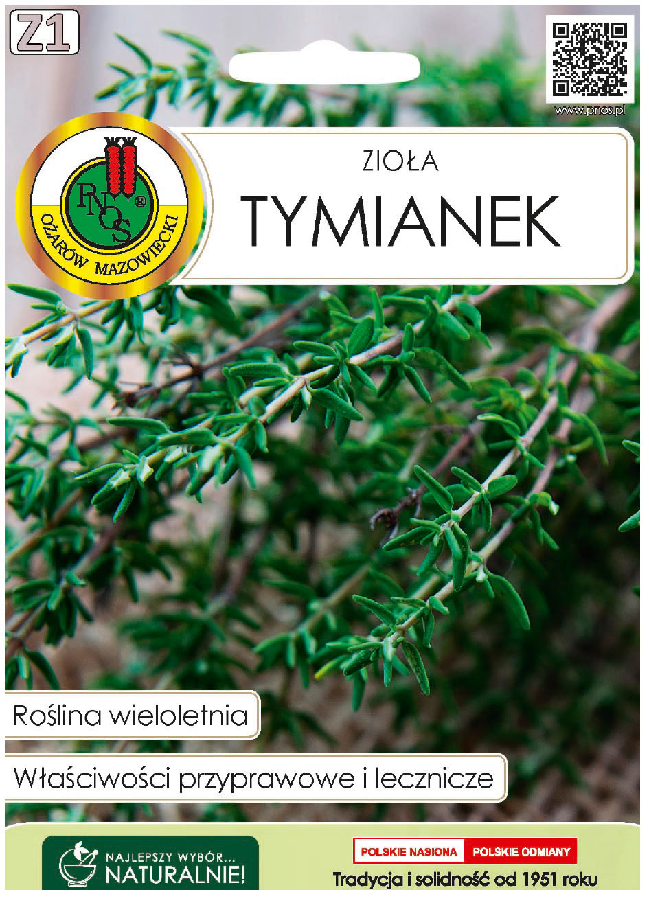 Tymianek Thymus vulgaris właściwy to roślina wieloletnia. Surowcem przyprawowym jest jego ziele, które zawiera olejki eteryczne. Charakteryzuje się aromatycznym i zapachem delikatnie piekącym, wytrawnym smakiem. Jego zielone liście są bogate w witaminę K, A, C i E oraz olejki eteryczne – tymol i karwol o działaniu rozkurczowym, bakteriobójczym i przekształcającym śluz zmagazynowany w górnych drogach oddechowych. Jego właściwości lecznicze pozwalają oczyścić, odmłodzić oraz wzmocnić organizm. Ma także właściwości bakteriostatyczne i przeciwzapalne.