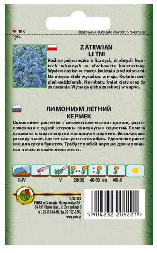 Zatrwian letni Haevenly Blue to roślina jednoroczna o szorstko owłosionych, pierzasto-klapowanych liściach tworzących rozetę. Pędy kwiatowe rozgałęzione, szorstko oskrzydlone, zakończone kłosowatymi kwiatostanami. Kwiaty drobne, różnobarwne, doskonałe do zasuszania. Wysiew nasion od marca do kwietnia, pod osłonami.