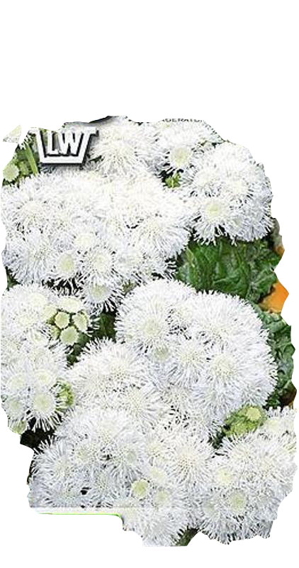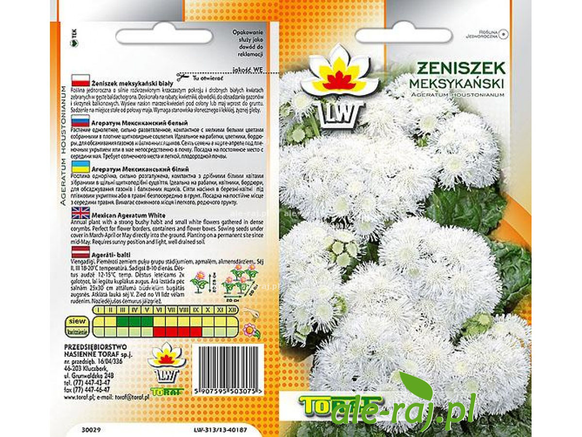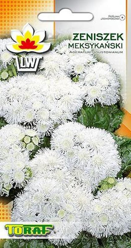 ŻENISZEK MEKSYKAŃSKI BIAŁY (Ageratum houstonianum) - jednoroczna roślina silnie rozkrzewiona, o krzaczastym pokroju. Tworzy drobne kwiaty zebrane w geste baldachogrona. Nadaje się na kwietniki, obwódki, rabaty, do obsadzania gazonów, skrzynek balkonowych. Nasiona wysiewamy pod osłony w III-IV lub bezpośrednio do gruntu w V. Na stałe miejsce sadzimy od połowy V. Roślina wymagająca słonecznego stanowiska oraz żyznej i lekkiej gleby.