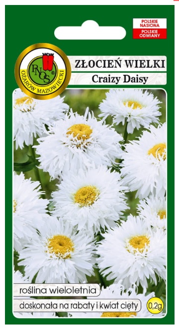 Złocień wielki Crazy Daisy biały to roślina wieloletnia o prostych, wzniesionych łodygach i ciemnozielonych, lancetowatych, ząbkowanych liściach. Kwiaty pełne lub półpełne, białe osadzone pojedynczo na szczytach pędów. Doskonała na rabaty i na kwiat cięty. Lubi gleby gliniasto-piaszczyste, żyzne, umiarkowanie wilgotne. Krótkowieczna bylina, aby przedłużyć jej żywotność należy dzielić rośliny co 2-3 lata, najlepiej wczesną wiosną.