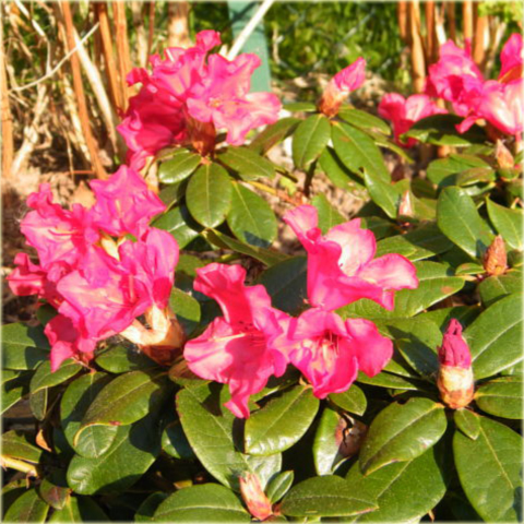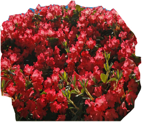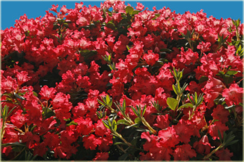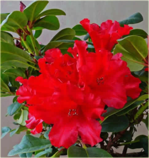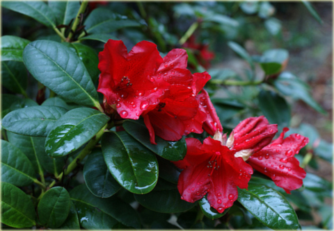 Liście tego różanecznika są jasnozielone, skórzaste i dość drobne. Wspaniale, intensywnie czerwone, dzwonkowate kwiaty rozwijają się w pierwszej połowie maja.