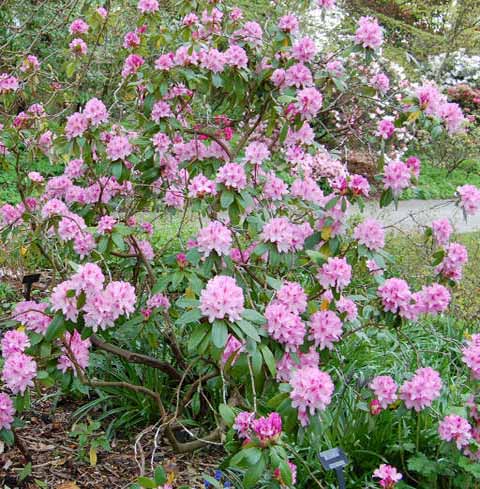 ym pokroju, tworzącą szerokostożkowe krzewy. Kwiaty różowe, z pięknym, bordowym oczkiem, osiągające wielkość do 6,5cm średnicy, zebrane w niewielkie kwiatostany. Najpiękniej rozkwitają w drugiej połowie maja. Liście lancetowate, ciemnozielone, lekko błyszczące, zimozielone.
