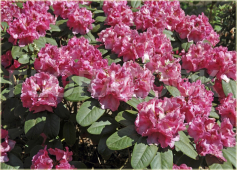 Liście szeroko owalne i zielone. Kwiaty purpuroworóżowe, z winno czerwonym rysunkiem wewnątrz, o średnicy 7,5 do 8,5cm, zebrane w dość duże kwiatostany (12 cm wysokości i 15 cm szerokości). W kwiatostanie znajduje się po 10-11 kwiatów. Kwitnie bardzo obficie w połowie maja.