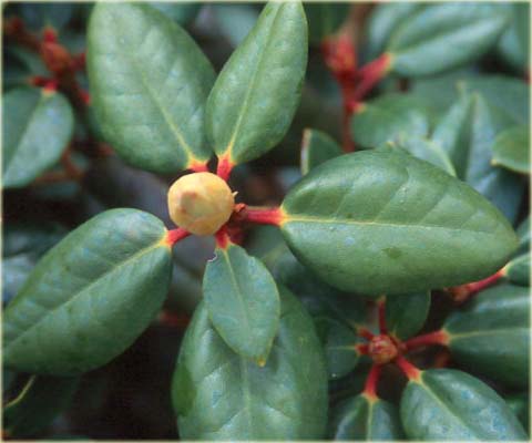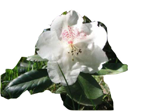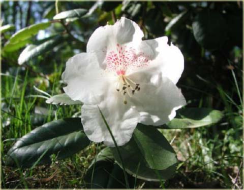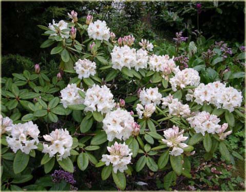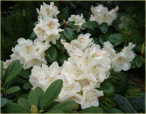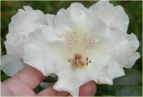 Liście błyszczące, ciemnozielone. Kwiaty tego rododendrona są kremowobiałe z małym, ciemnoczerwonym rysunkiem. Brzegi płatków uroczo, lekko pofalowane. Kwitnie w maju.