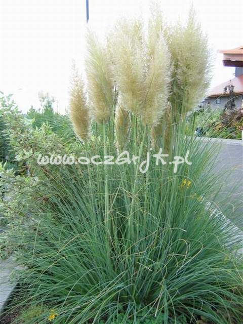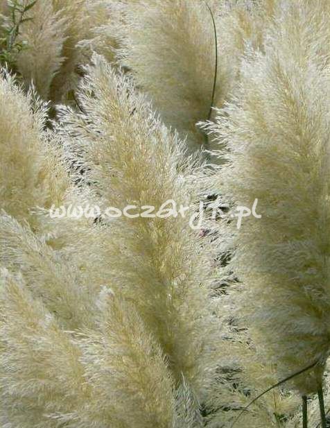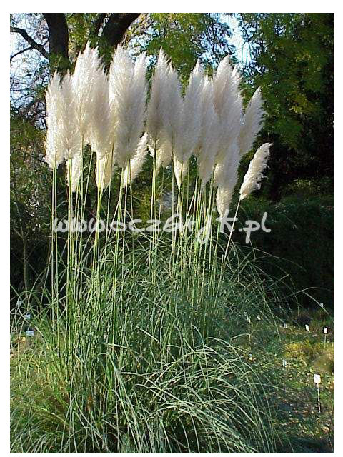 Trawa pampasowa Cortaderia selloana white Walory dekoracyjne tej okazałej, tworzącej gęste kępy trawy, doceniono już w XIX wieku. Jest gatunkiem dwupiennym, co oznacza, że kwiatostany męskie i żeńskie znajdują się na różnych roślinach, a nie jak u większości traw, w tych samych kłoskach. Większą wartość dekoracyjną mają kwiatostany żeńskie, które są bardziej gęste i puszyste, dzięki długim jedwabistym włoskom u podstawy kłosków . Roślina kwitnie pod koniec września i na początku października. Do tego czasu ozdobą są kępy sztywnych, płaskich, wzniesionych lub zwisających blaszek liściowych, do 2,5 m długości, z ostrymi, drobno piłkowanymi brzegami. W ogrodach może być uprawiana jako roślina soliterowa, w centralnej części trawnika, w sąsiedztwie zbiorników wodnych lub w grupach jako tło dla rabat kwiatowych.